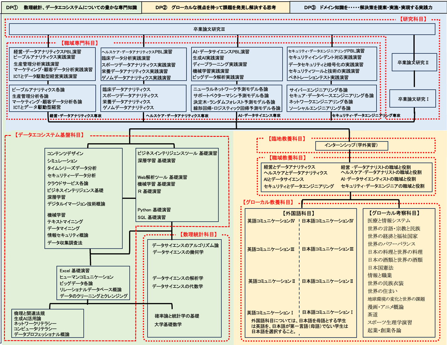 本学部の教育プログラム(カリキュラム)はデータプロフェッショナルに必要なスキルを身につけるための授業科目を純粋に体系化したもので、これら授業内容に習熟した専門家が教員として配置された学部です。