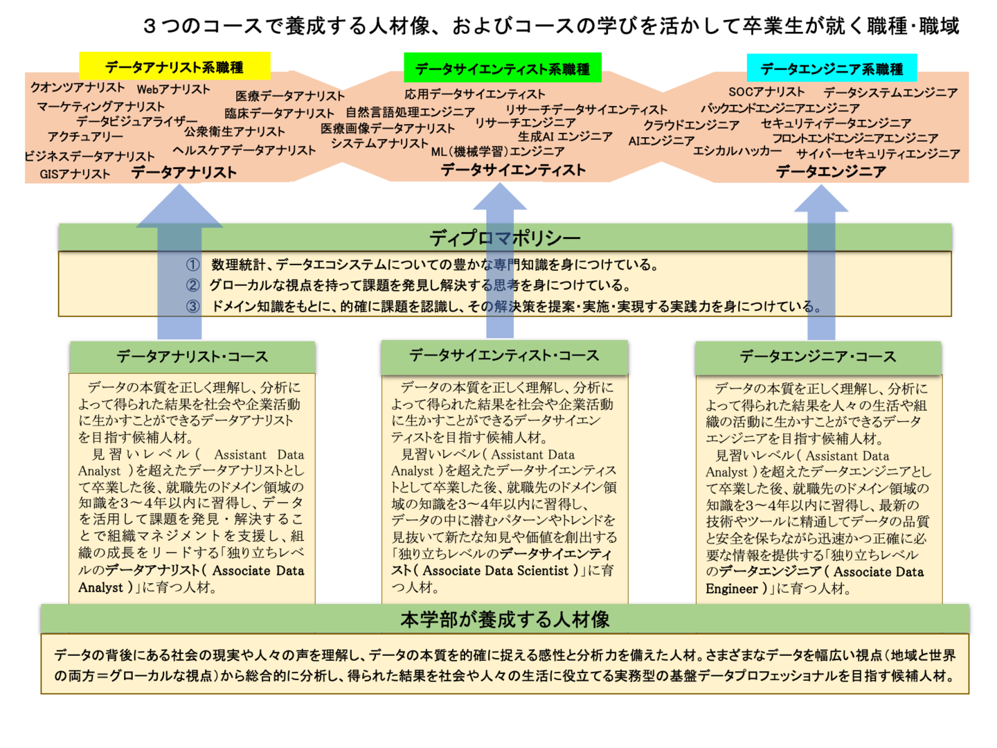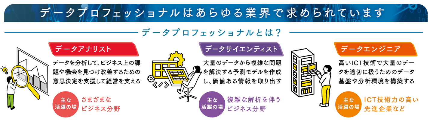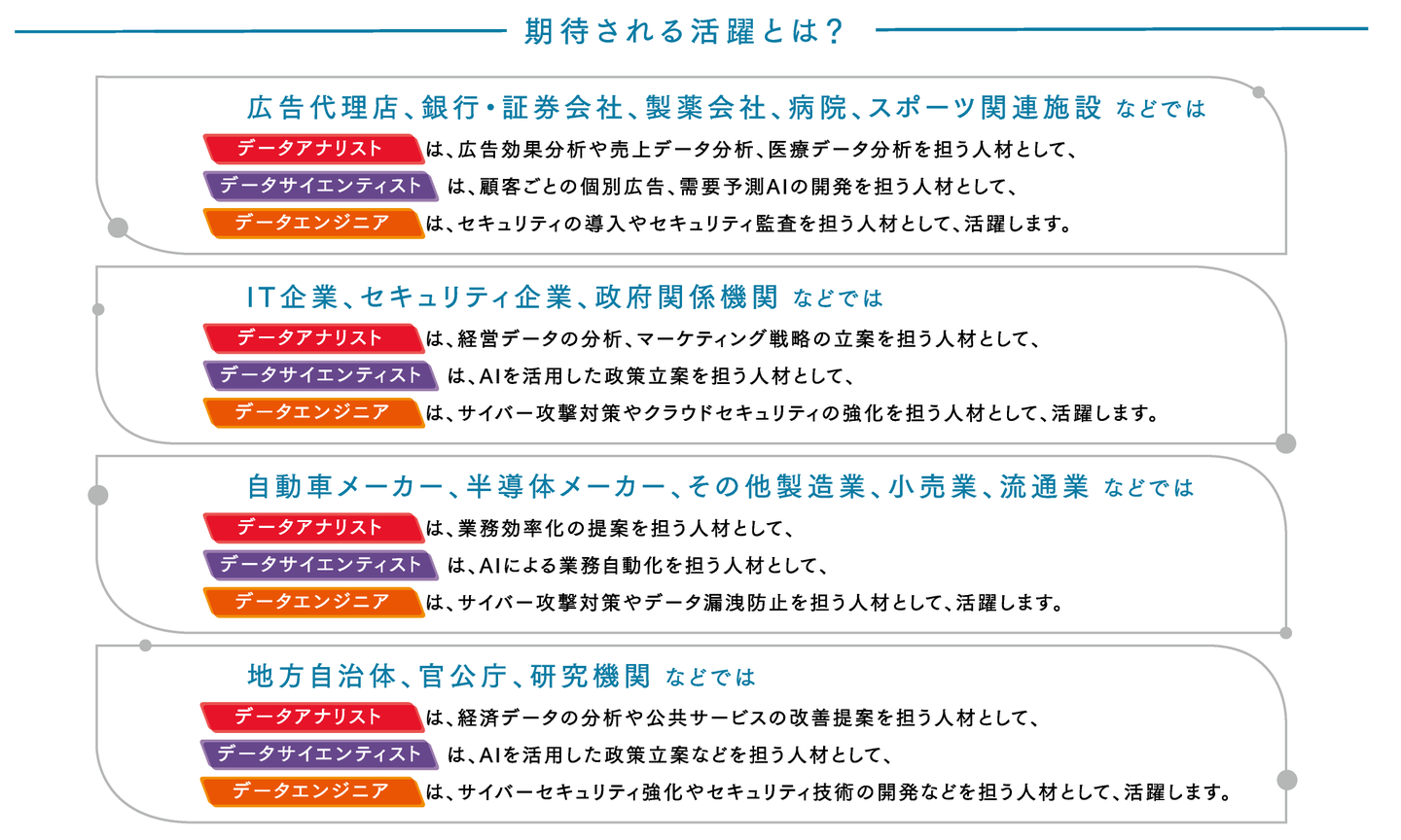 あらゆる組織における意志決定にデータが活用されるデータ駆動型社会においては、データプロフェッショナルの職種・職域のすそ野は広く、本学部の卒業生が活躍する職種・職域は今後ますます拡大することが予想されます。以下に挙げた職種・職域はいずれも中核となる3職種(データアナリスト、データサイエンティスト、データエンジニア)の派生型職種・職域と捉えることができるため、本学部の卒業生が就職先となる組織において就く可能性が高い職種・職域となります。